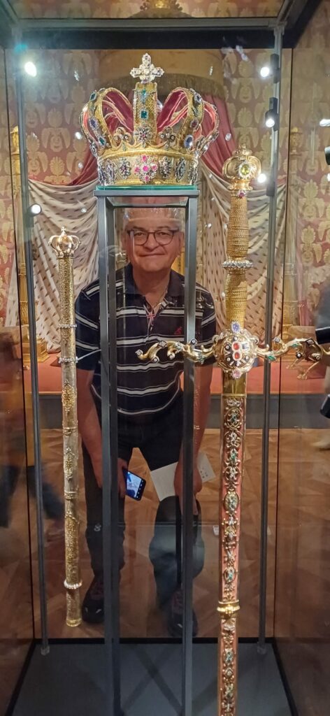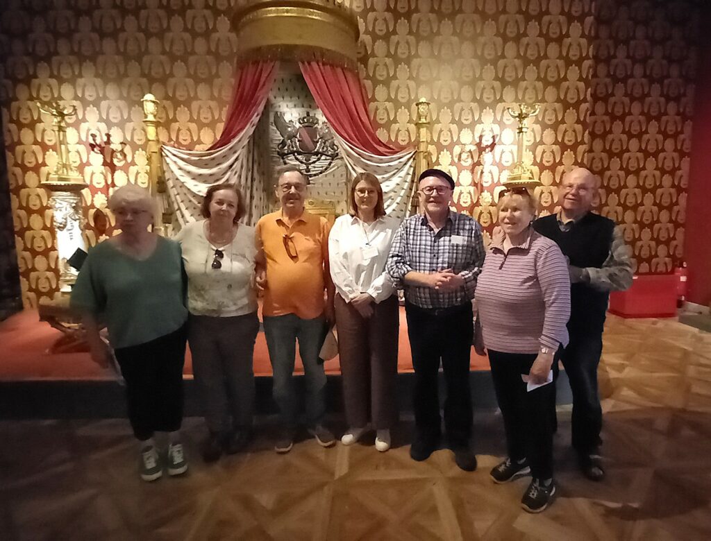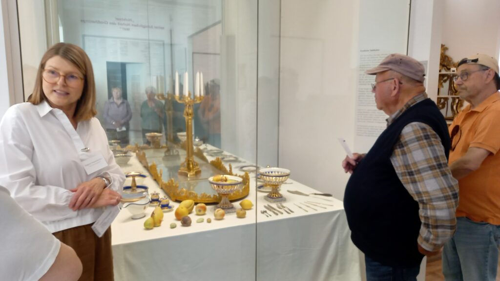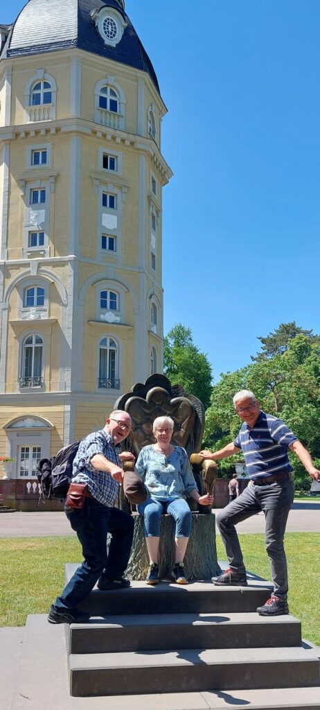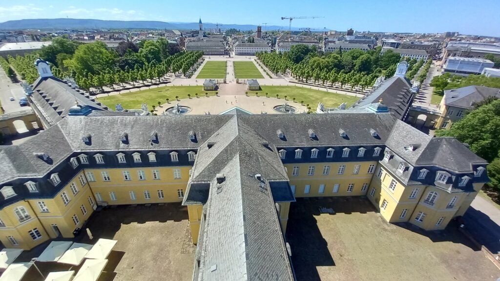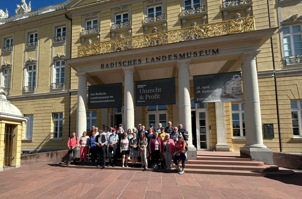Die alte badische Residenz Karlsruhe mit ihrem beeindruckenden Schloss und dem ausgedehnten Stadtgarten standen am Freitag auf dem Programm. Aus organisatorischen Gründen besuchten zwei Gruppen jeweils im Wechsel die beiden Destinationen. Im Schloss gab es noch einmal eine Aufteilung in eine deutsche und französische (Ein-)Führung in die badische Geschichte – der Name Kaspar Hauser durfte dabei auf keinen Fall fehlen – leider mit relativ wenigen Ausstellungsstücken aus der Zeit der Markgrafschaft und des Großherzogtums Baden. Der Großteil der Sammlung fiel dem Bombardement des Zweiten Weltkriegs zum Opfer. Dennoch beeindruckend: die großherzoglichen Insignien der Macht mit Thronsessel, Baldachin und Kandelabern und natürlich Zepter und Prunkschwert. Wirklich atemberaubend dann der Blick oben aus dem Turm auf Schloss und Stadt – und das bei strahlendem Sonnenschein!