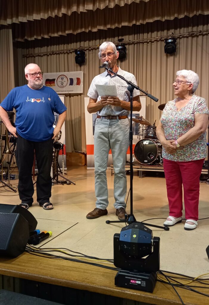 Und dann kam er, der große Festabend mit 110 Gästen in der prall gefüllten Aegidiushalle. Unter ihnen auch – eigens für diesen Tag aus Tigy angereist! – Bürgermeister Noël Le Goff mit Gattin und Bürgermeisterstellvertreter Frédéric Jove, ferner Leimens Bürgermeisterin Claudia Felden, Leimens Radportlegende und Ehrenbürger Günter Haritz sowie die beiden Ehrenbürger aus Tigy Gilles Blain und Rudi Sailer.